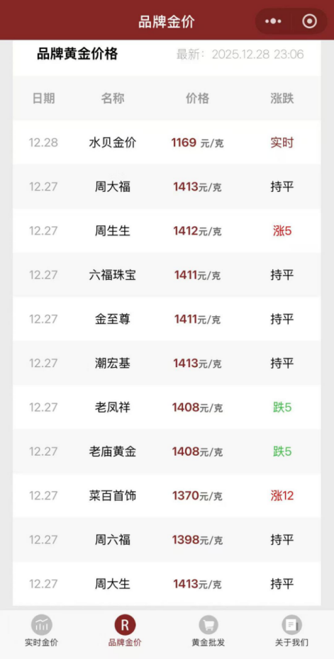 截至12月27日,国内主要品牌足金饰品价格悉数站上1410元/克,每克价格相较于今年1月初上涨600元左右。今日金价小程序显示,周大福、潮宏基、周大生的金饰克价均达1413元,此外,周生生(00116.HK)、六福珠宝、老庙黄金、老凤祥(600612.SH)等国内主要品牌金饰价格均超1400元/克。