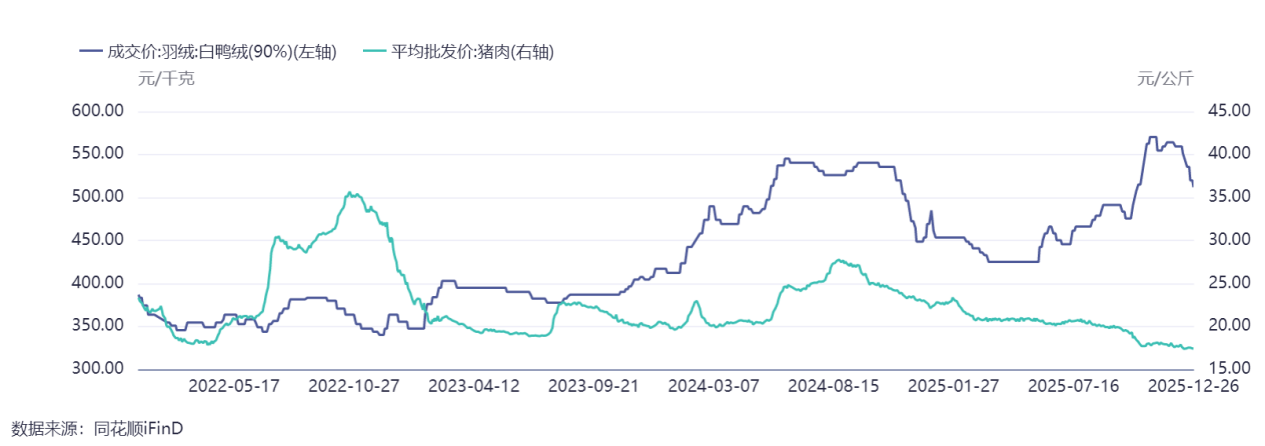 业内分析指出,受猪肉价格下跌影响,鸭肉、鹅肉需求减少,叠加养殖端行业产能调整,羽绒供应收缩,对羽绒价格形成支撑。据农业农村部监测,2025年12月15—21日,生猪定点屠宰企业生猪平均收购价格为13.01元/公斤,同比下降25.2%。白条肉平均出厂价格为17.03元/公斤,同比下降24.9%。 2025年12月19日--2025年12月25日当周,猪肉批发价为17.47元/公斤,同比下降。