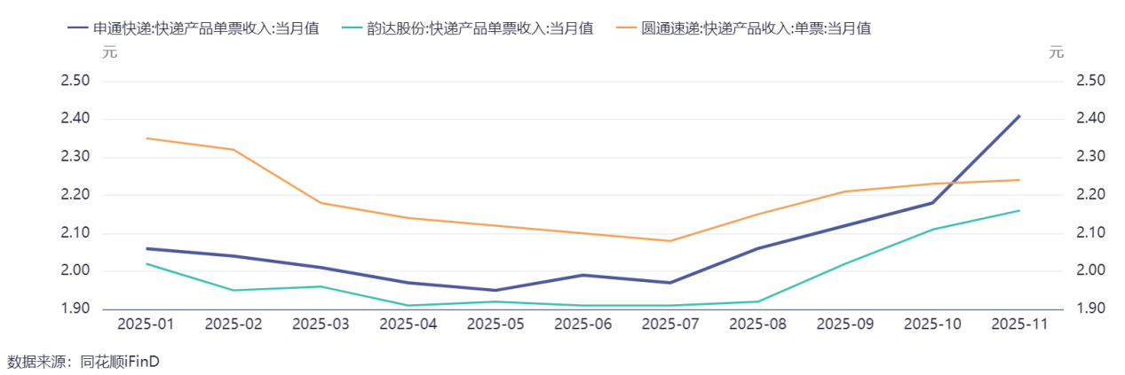 随着“反内卷”政策逐步落地,快递行业反“内卷”已初见成效。国盛证券12月份研报显示,2025年10月快递行业单票收入为7.48元,同比下降3.0%,但环比降幅收窄。申通和韵达单票收入分别提升7.4%和4.5%,企业盈利弹性释放。