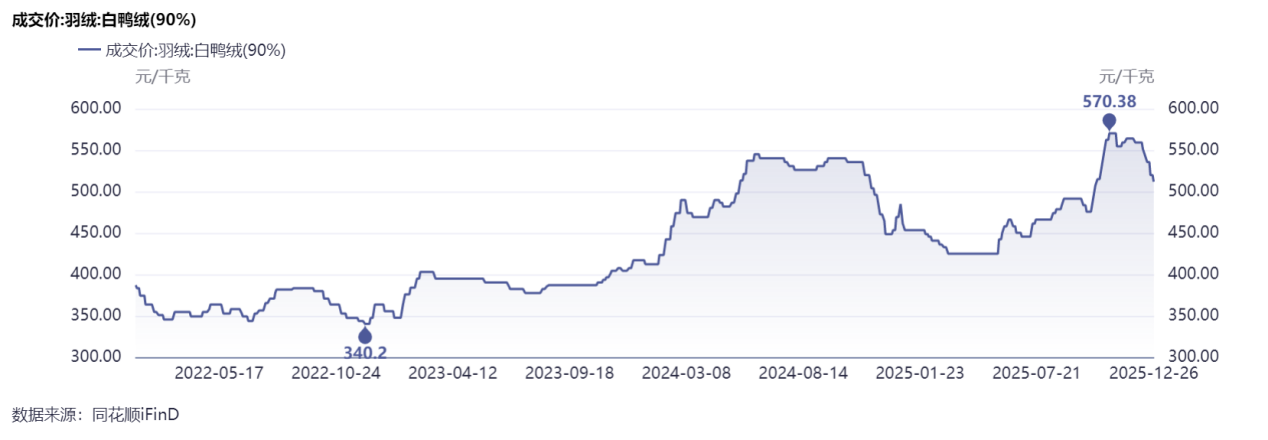 原料方面,羽绒原材料的价格疯狂上涨是今年羽绒服价格飙升的核心原因。目前市面上主流羽绒服以鸭绒和鹅绒为填充物,而此轮涨价主要集中在鸭绒上。同花顺iFinD数据显示,2025年11月4日,90%白鸭绒成交价飙升至570.38元/千克,达到近4年高点,较近年低点的340.2元/千克上涨68%。
