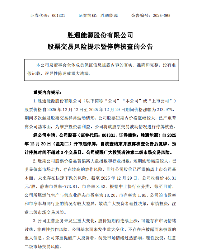 12月29日晚间,12连板胜通能源(001331.SZ)发布公告称,股票价格自2025年12月12日至2025年12月29日期间价格涨幅为213.97%,期间多次触及股票交易异常波动情形,公司股票短期内价格涨幅较大,已严重背离公司基本面,为维护投资者利益,公司将就股票交易波动情况进行停牌核查。