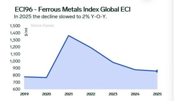 大宗商品数据公司Expana最新报告显示,2025年,全球铁基金属指数(EIC)同比下降2%,降幅有所放缓。2025年,中国出口欧洲热轧卷(HRC)价格同比下跌 11%。