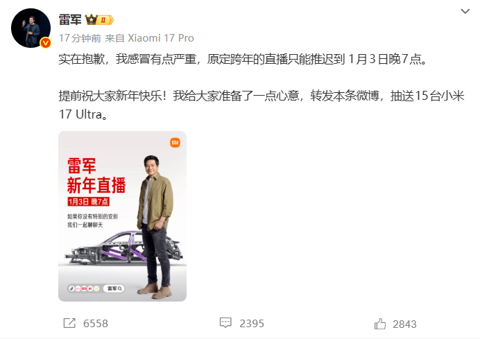 12月31日,小米集团-W(01810.HK)董事长雷军发文称,感冒有点严重,原定跨年的直播推迟到1月3日晚7点。此外,雷军表示转发本条微博,抽送15台小米17 Ultra。