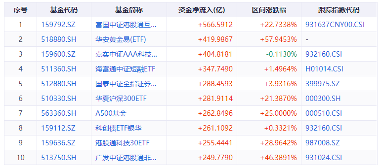 根据同花顺iFinD,以年度为单位来统计,截至2025年12月30日,富国中证港股通互联网ETF是2025年资金净流入金额最大的产品,年内资金净流入规模为566.59亿元。该基金跟踪港股通互联网指数,年内涨幅为22.73%。