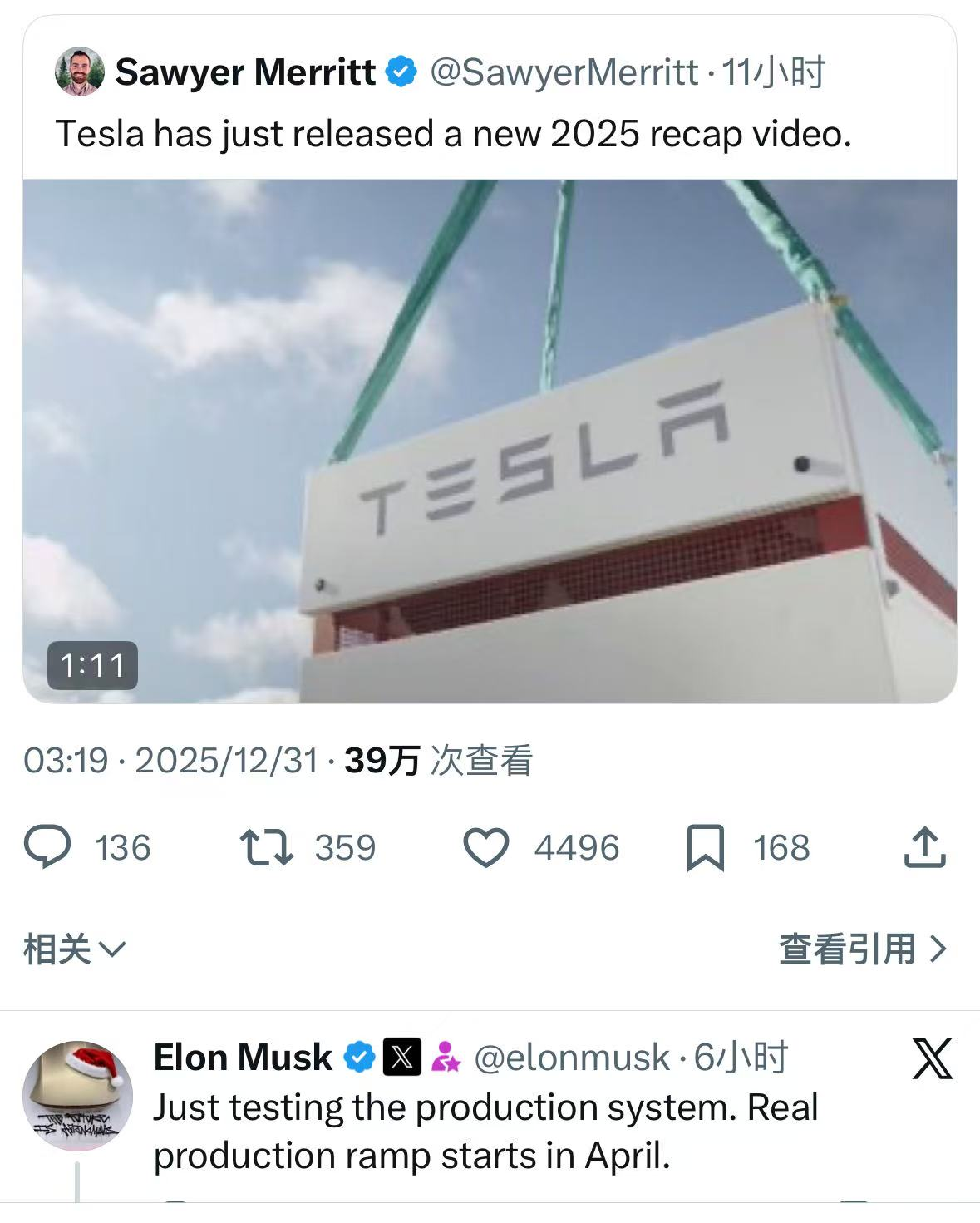 另外,马斯克在X上回应,特斯拉目前正在测试Cybercab生产系统,实际量产将于4月份开始。