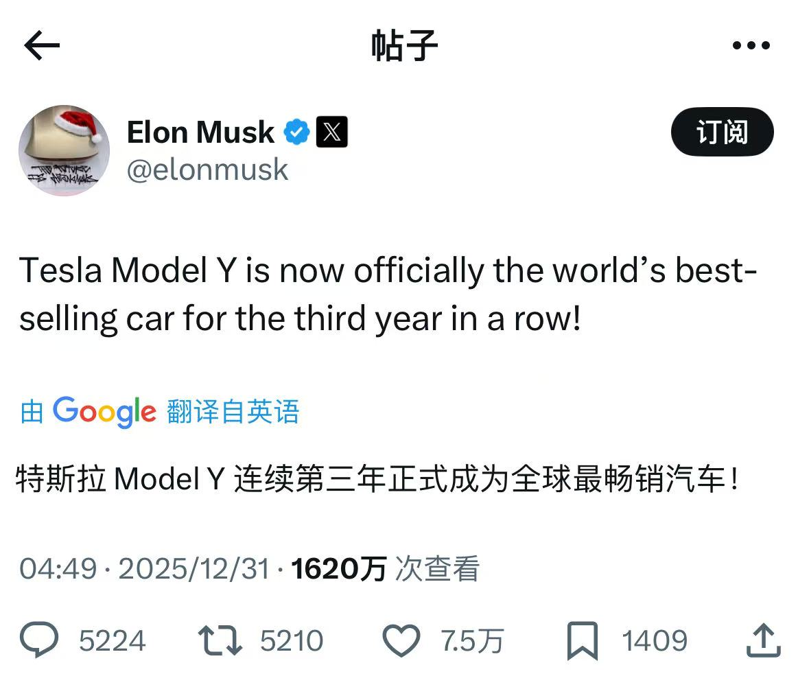 12月31日,特斯拉(TSLA.US)CEO马斯克在社交平台X上发帖表示,特斯拉Model Y现在正式连续第三年成为全球最畅销的汽车。