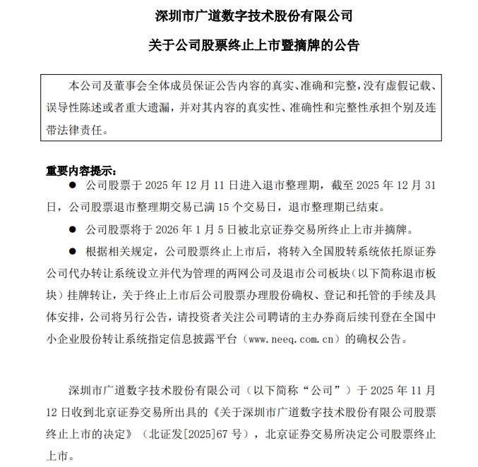 广道退:公司股票将于2026年1月5日终止上市并摘牌