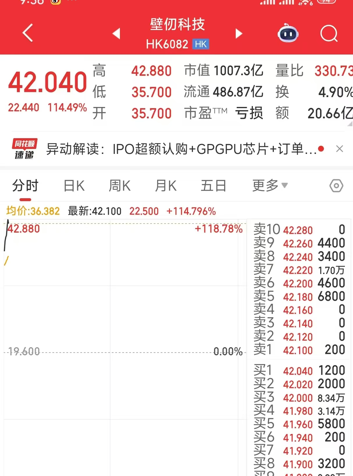 周五早盘,“港股GPU第一股”壁仞科技(06082.HK)首日开盘涨82%,开盘后继续上涨,目前股价涨幅涨幅110%,最高触及42.88港元。