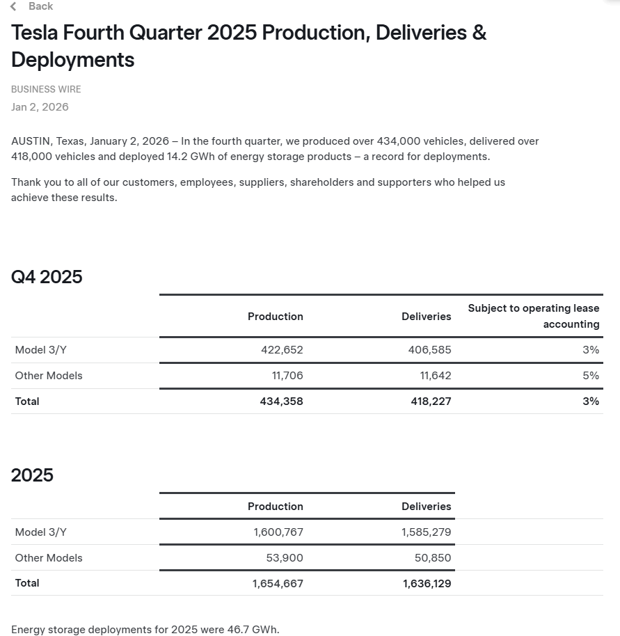 周五晚间,特斯拉(TSLA.US)在其官网公布了2025年第四季度运营数据。2025年第四季度共交付418,227辆新车、生产434,358辆;全年交付1,636,129辆,生产1,654,667辆。这一数据不仅低于大多数分析师预期,也低于本周初特斯拉自己制作的“市场共识预期”。