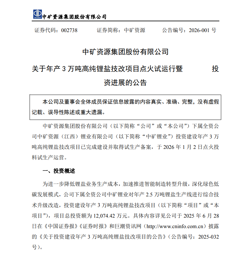 1月4日,中矿资源(002738.SZ)公告称,公司下属全资公司中矿锂业投资建设的年产3万吨高纯锂盐技改项目已完成建设并取得试生产备案,于2026年1月2日点火投料试生产运营。项目总投资额为1.2亿元,投产后公司将合计拥有年产7.1万吨电池级锂盐产能,锂盐业务的综合竞争力进一步增强。