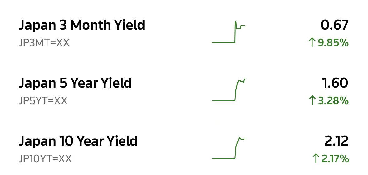 日本10年期国债收益率升至2.127%,达到1999年2月以来的26年11个月高位。5年期国债收益率冲上1.6%,创2007年以来最高水平。