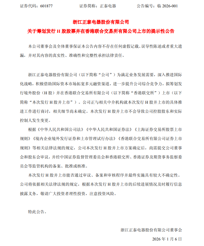 1月5日,正泰电器(601877.SH)公告称,公司为满足业务发展需要,深入推进国际化战略,积极借助国际资本市场拓宽多元融资渠道,拟筹划发行境外股份(H股)并在香港联合交易所有限公司上市。公司正与相关中介机构就本次发行H 股并上市的具体推进工作进行商讨,相关细节尚未确定。本次发行H股并上市不会导致公司控股股东和实际控制人发生变更。