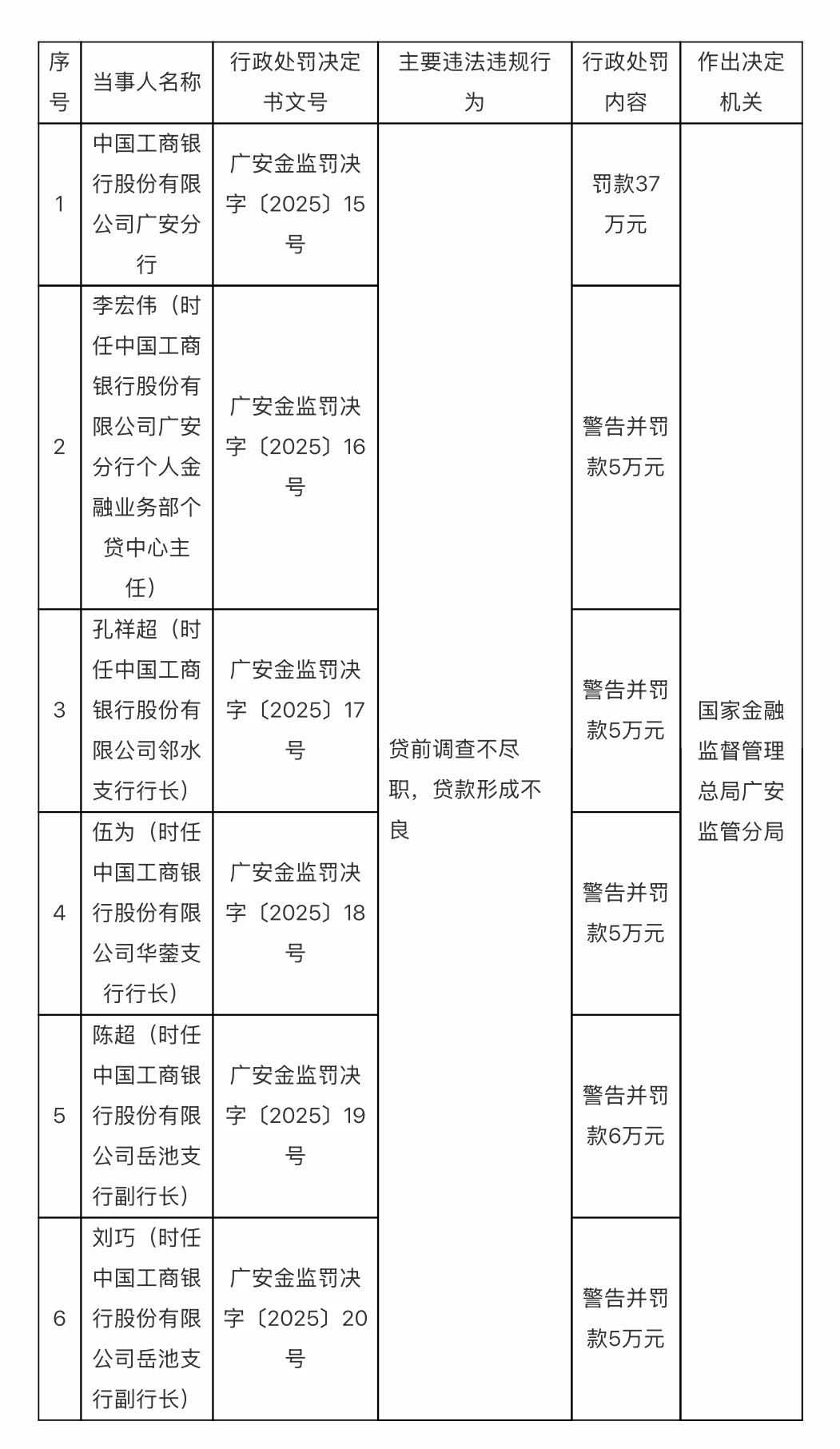 同日,国家金融监督管理总局广安监管分局发布的行政处罚信息显示,因贷前调查不尽职、贷款形成不良,中国工商银行股份有限公司广安分行被罚款37万元;李宏伟(时任中国工商银行股份有限公司广安分行个人金融业务部个贷中心主任)被警告并罚款5万元;孔祥超(时任中国工商银行股份有限公司邻水支行行长)被警告并罚款5万元;伍为(时任中国工商银行股份有限公司华蓥支行行长)被警告并罚款5万元;陈超(时任中国工商银行股份有限公司岳池支行副行长)被警告并罚款6万元;刘巧(时任中国工商银行股份有限公司岳池支行副行长)被警告并罚款5万元。