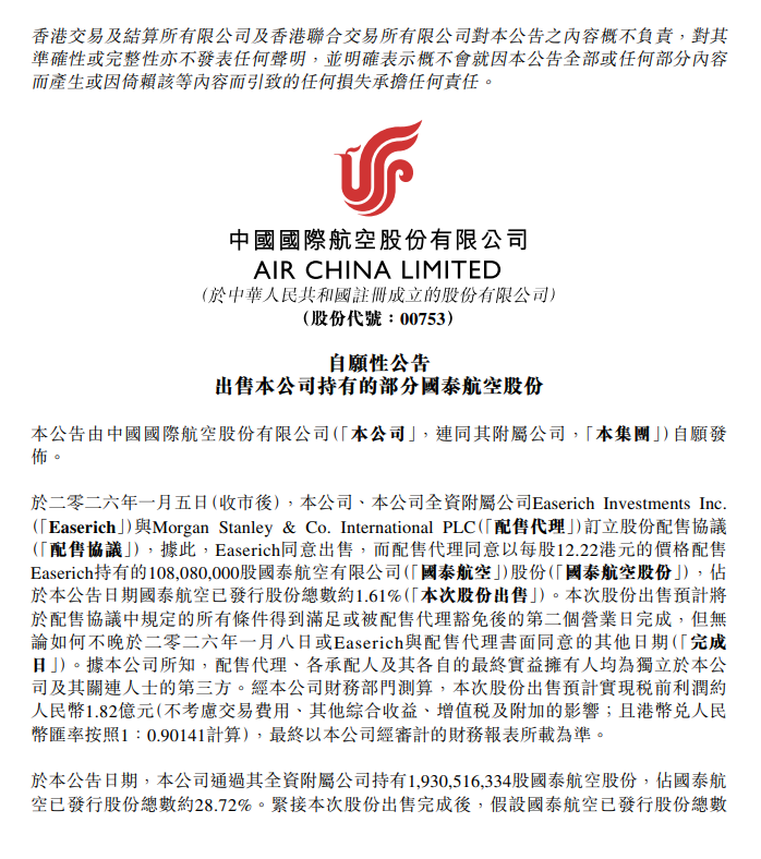 1月6日,中国国航(00753.HK)在港交所公告,2026年1月5日,公司、公司全资附属公司Easerich Investments Inc.(“Easerich”)与Morgan Stanley & Co. International PLC(“配售代理”)订立股份配售协议,据此,Easerich同意出售,而配售代理同意以每股12.22港元的价格配售Easerich持有的1.0808亿股国泰航空股份,占于本公告日期国泰航空已发行股份总数约1.61%。经公司财务部门测算,本次股份出售预计实现税前利润约人民币1.82亿元。