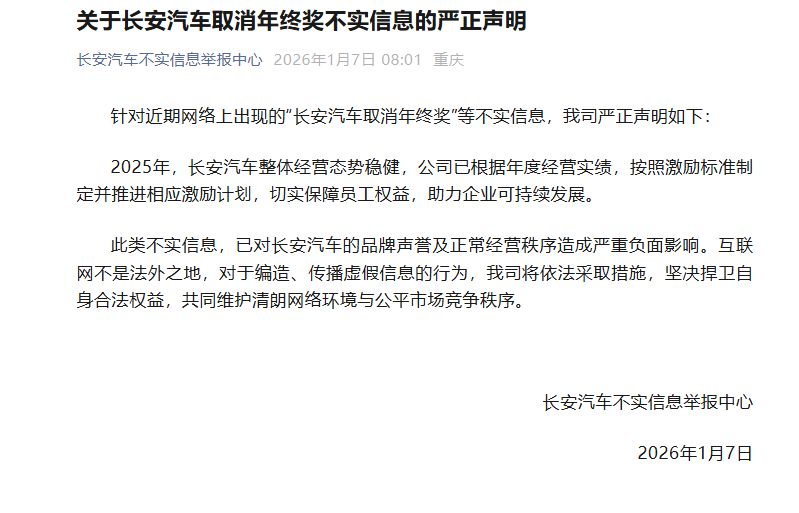 1月7日,长安汽车(000625.SZ)发文称,针对近期网络上出现的“长安汽车取消年终奖”等不实信息,公司严正声明如下: