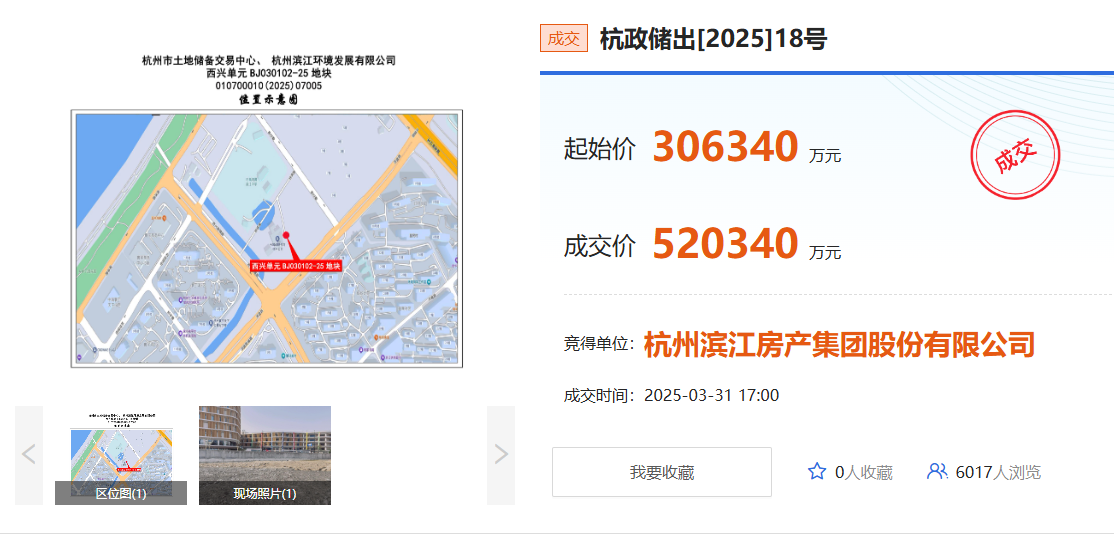 据悉,滨江水电新村地块土地面积23145㎡,容积率上限2.5,地上建筑面积67219.5㎡,在2025年3月25日成功出让。出让当天,竞拍过程中异常激烈,最终经过72轮竞价,滨江集团以约52.03亿元的总价竞得,折合楼面价约77409元/㎡,溢价率约69.86%。