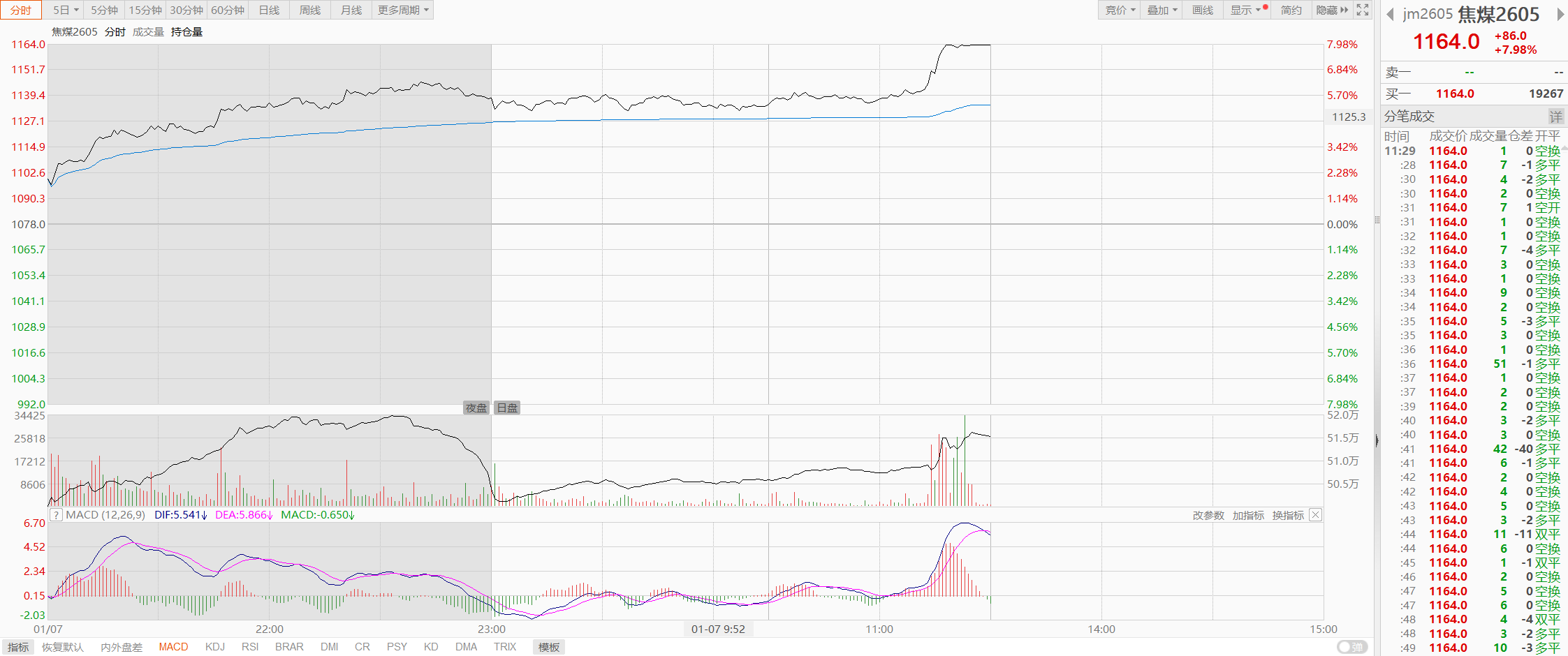 1月7日,截至中午收盘,焦煤期货主力合约焦煤2605上涨7.98%,触及涨停,报收1164元/吨。此外,沪镍2602涨超7%,焦炭2605涨超6%,沪锡2602、玻璃605、纯碱605涨超5%。