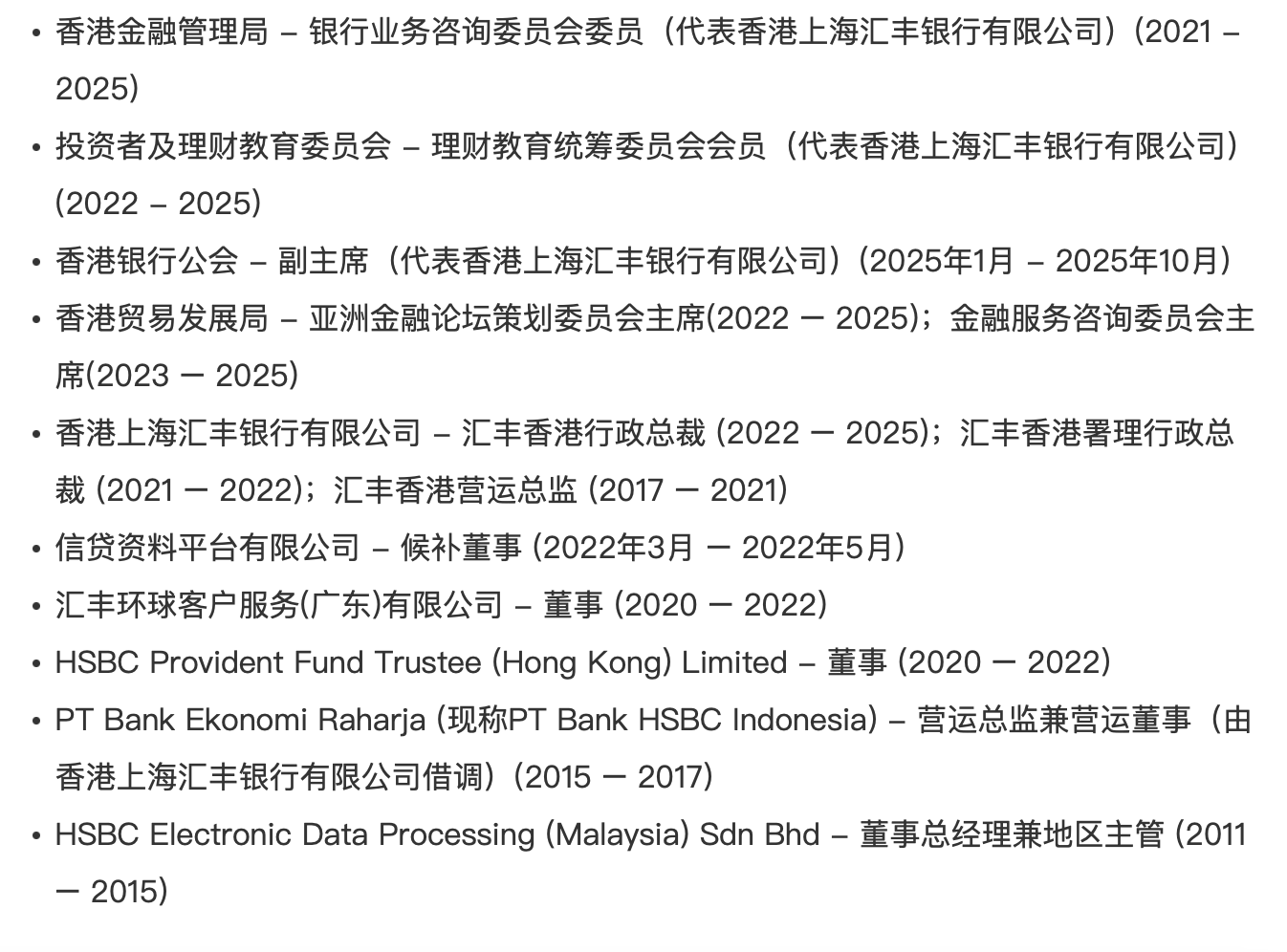 林慧虹担任的其他职务有:香港金融发展局董事会成员、市场推广小组成员、东盟顾问团成员;金融学院有限公司会员;香港金融管理局金融基建及市场发展委员会委员;HSBC Bank(Vietnam)Ltd.董事、风险委员会成员;香港公益金董事、执行委员会委员;财资市场公会议会成员。