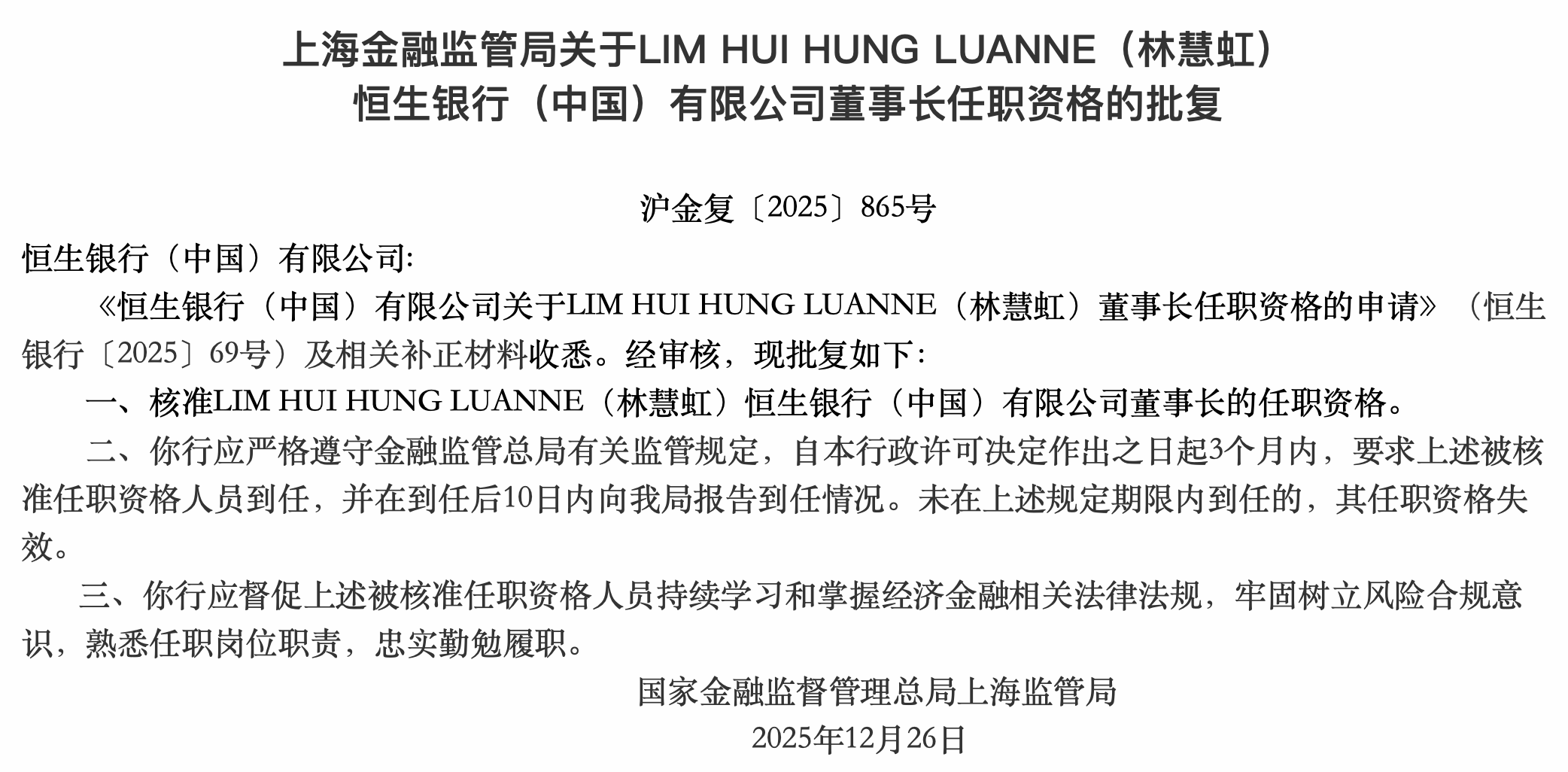 1月7日,上海金融监管局发布的行政许可信息显示,核准 LIM HUI HUNG LUANNE(林慧虹)恒生银行(中国)有限公司董事长的任职资格。