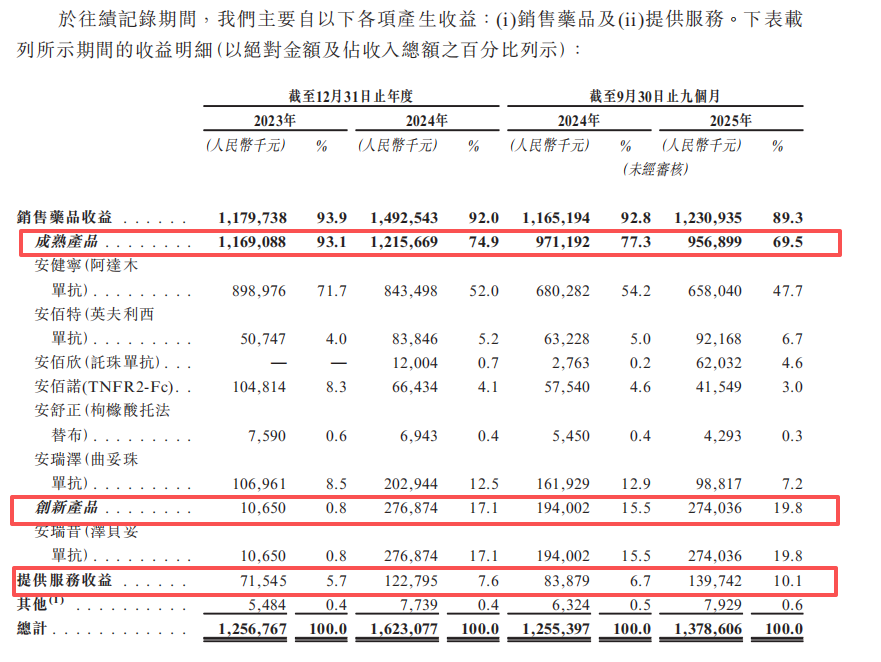 招股书显示,2023年到2025年前三季度,博锐生物分别实现营业收入12.57亿元、16.23亿元和13.79亿元,其中成熟产品的销售收益分别为11.69亿元、12.16亿元和9.57亿元,收入贡献比分别为93.1%、74.9%和69.5%。