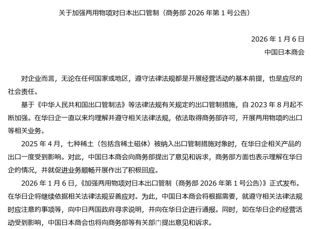 1月7日,中国日本商会官网发表声明称,2026年1⽉6⽇,《加强两⽤物项对⽇本出⼝管制(商务部2026年第1号公告)》正式发布。在华⽇企将继续依据相关法律法规妥善应对。为此,中国⽇本商会将根据需要,就遵守相关法律法规时应注意的事项等,向中⽇两国政府寻求说明,并向在华⽇企进⾏通报。同时,如在华⽇企的经营活动受到影响,中国⽇本商会也将向商务部等有关部门提出意见和诉求。