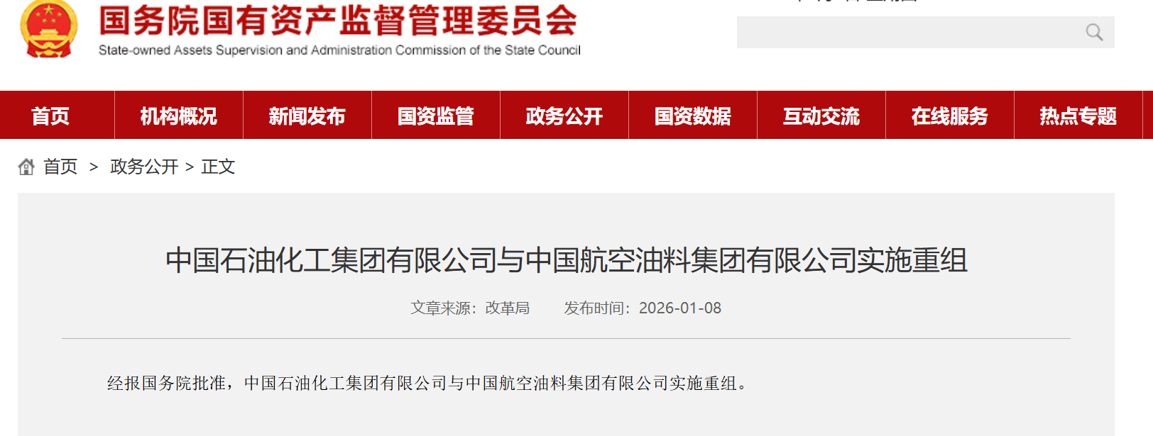 1月8日,据国务院国有资产监督管理委员会官网消息,经报国务院批准,中国石油化工集团有限公司与中国航空油料集团有限公司实施重组。