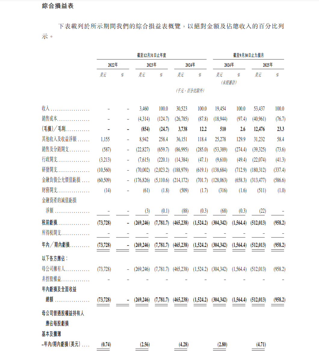 财务数据方面,2023年-2025年前三季度,MiniMax分别实现营业收入346.0万美元、3052.3万美元和5343.7万美元;分别产生净亏损2.69亿美元、4.65亿美元和5.12亿美元。