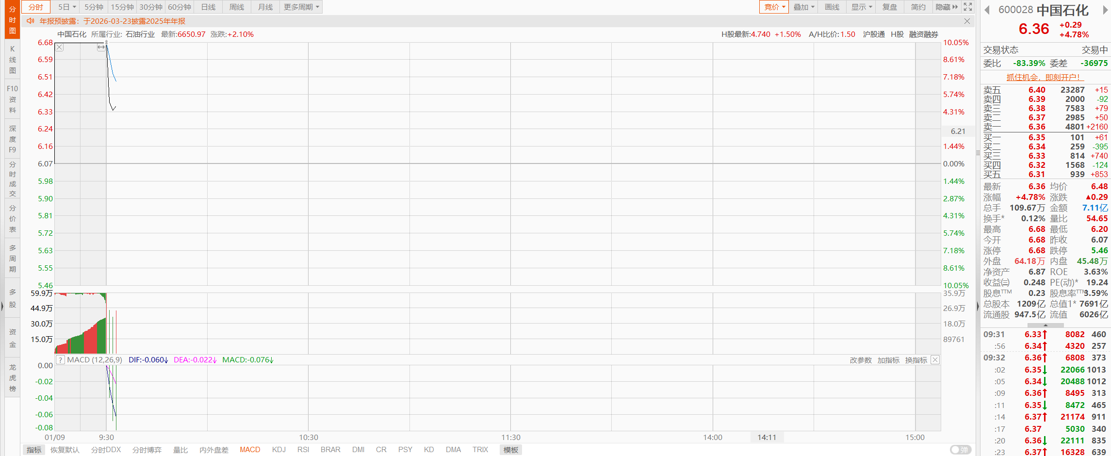 1月9日,中国石化(600028.SH)竞价触及涨停,股价报6.68元/股,开盘后迅速下杀。