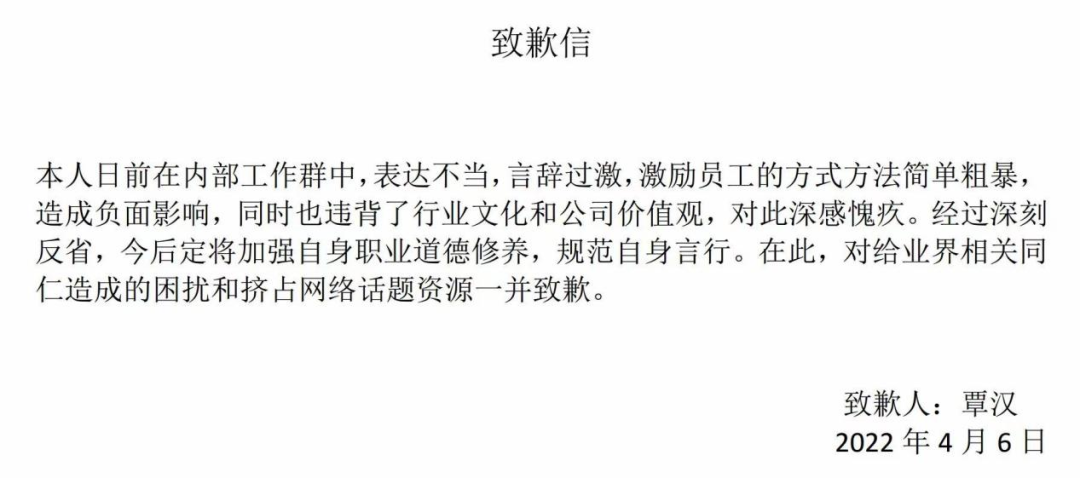 该言论在社交媒体持续发酵后,覃汉随即发布致歉信。他在信中表示:“本人日前在内部工作群中,表达不当,言辞过激,激励员工的方式方法简单粗暴,造成负面影响,同时也违背了行业文化和公司价值观,对此深感愧疚。经过深刻反省,今后定将加强自身职业道德修养,规范自身言行。在此,对给业界相关同仁造成的困扰和挤占网络话题资源一并致歉。”