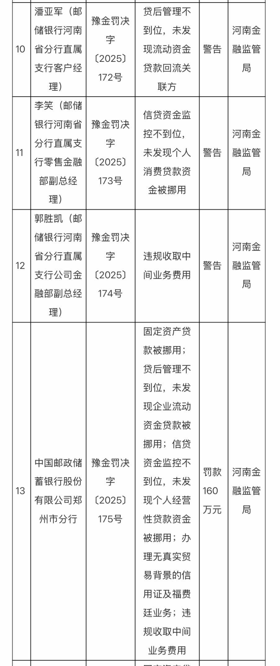 因固定资产贷款被挪用;贷后管理不到位,未发现企业流动资金贷款被挪用;信贷资金监控不到位,未发现个人经营性贷款资金被挪用;办理无真实贸易背景的信用证及福费廷业务;违规收取中间业务费用等,邮储银行郑州市分行被罚款160万元,郭学庆(时任邮储银行郑州市分行副行长)、温怡博(时任邮储银行郑州市分行普惠金融部副总经理)、景李真(时任邮储银行郑州市分行三农金融事业部总经理)、郭菁玲(时任邮储银行郑州市分行公司金融部副总经理)4人被警告。