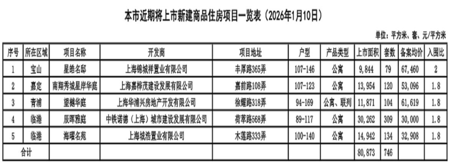 2026年1月10日,上海市2026年度首批新建商品住房项目获批上市。本次共推出5个项目,总计供应房源746套,分布于宝山、嘉定、青浦及临港等区域。