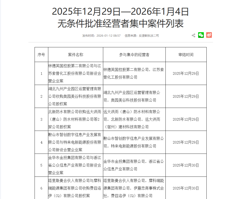 1月12日,市场监管总局发布2025年12月29日—2026年1月4日无条件批准经营者集中案件列表。其中包括广汽零部件有限公司与万力轮胎股份有限公司收购广东中创智腾技术服务有限公司股权案、中国汽车技术研究中心有限公司收购长春汽车检测中心有限责任公司股权案、华润电力控股有限公司与江苏悦达低碳科技发展有限公司新设合营企业案等。
