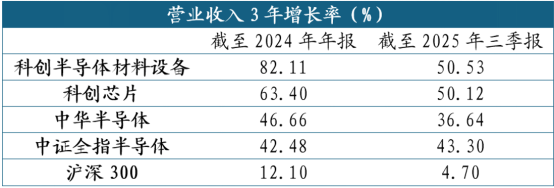 科创半导体材料设备指数成分股表现出相较于同行业指数更强的成长性,截至2024年年报,2025年中报营业收入3年增长率分别为82%,49%,大幅领先科创芯片、中证全指半导体成分股表现。