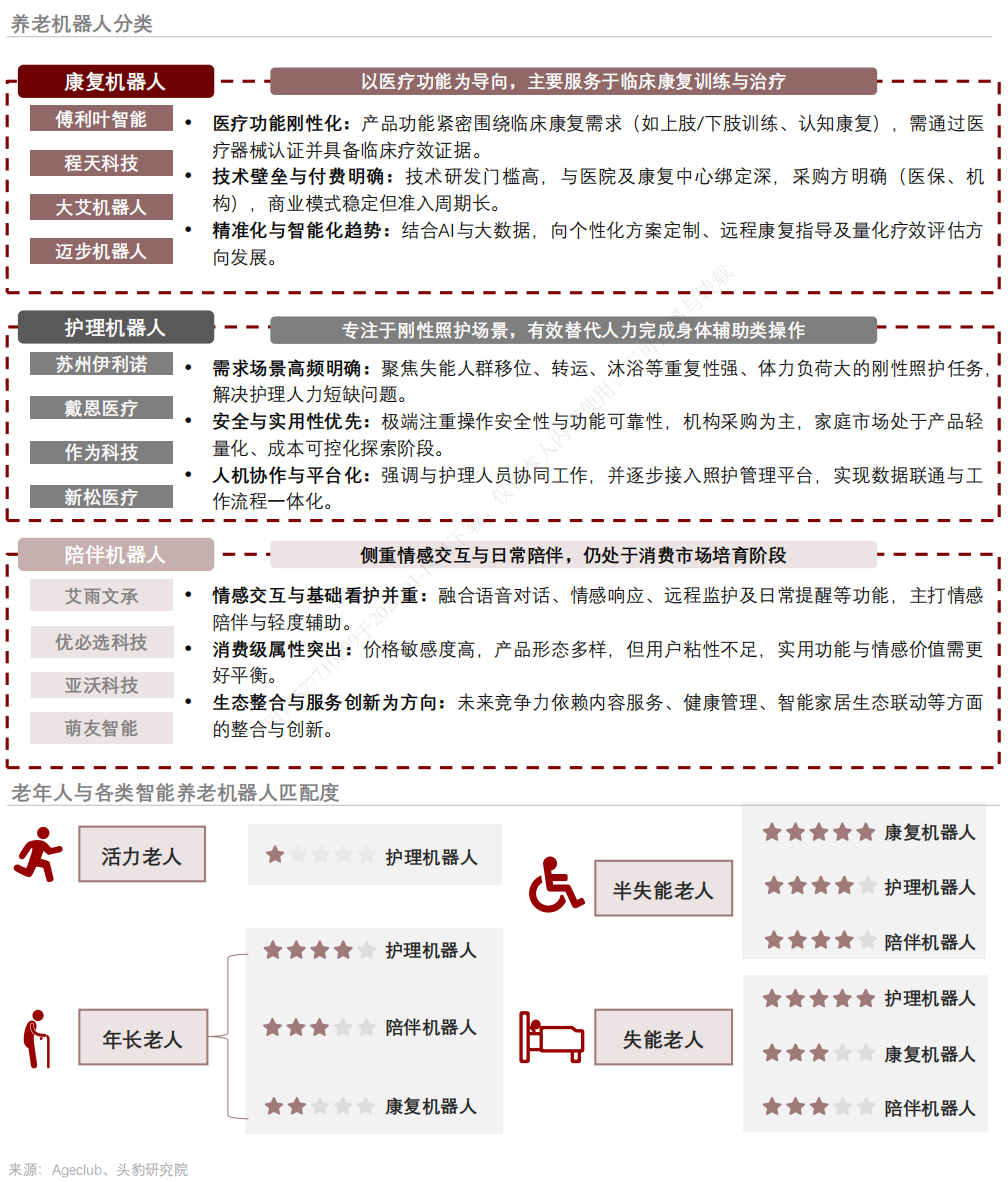 护理机器人专注于刚性照护场景,有效替代人力完成身体辅助类操作,涉及公司包括苏州伊利诺、戴恩医疗、作为科技、新松医疗等。