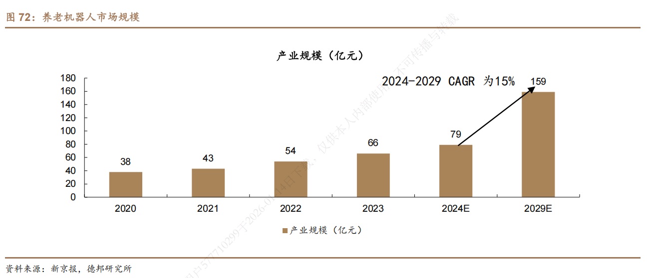 德邦证券研报指出,从市场规模来看,2023年我国养老机器人市场规模约为66亿元,预计到2029年将达到159亿元。2024年—2029年的复合年均增长率为15%,行业进入快速放量期。