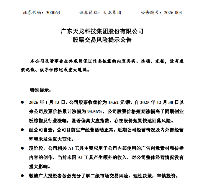 1月13日,天龙集团(300063.SZ)公告称,公司股票自2026年1月9日至2026年1月13日连续3个交易日以涨停价收盘,自2025年12月30日以来,公司股票价格累计涨幅为93.56%,公司股票价格短期涨幅高于同期创业板综指及行业涨幅,显著偏离大盘指数,存在股价短期快速回落风险。