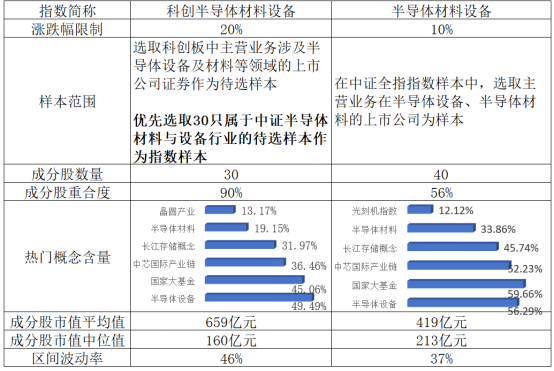 3.“科创半导体材料设备”涨跌幅限制20%波动更大,“半导体材料设备”限10%走势相对平稳