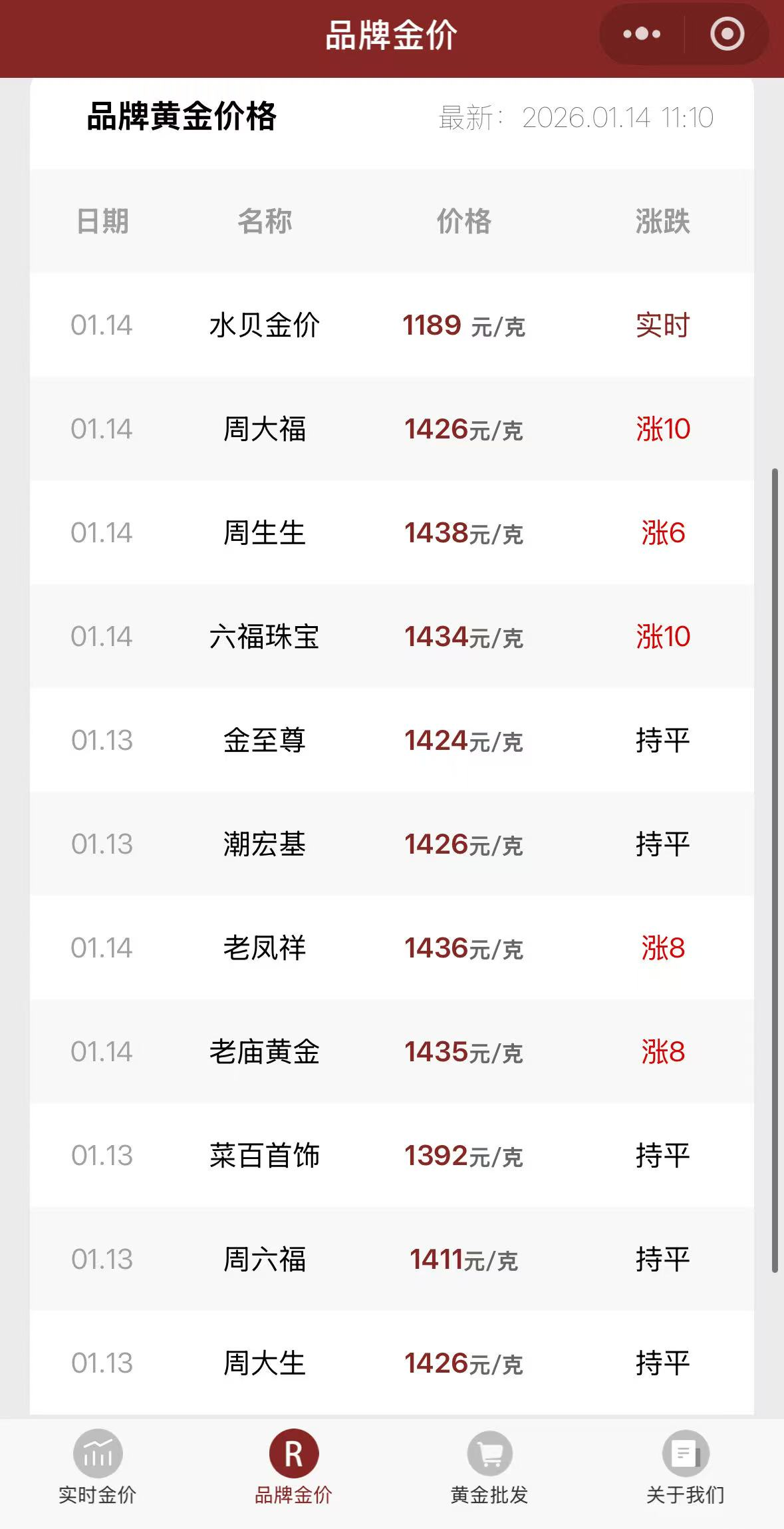随着国际金价走高,国内黄金饰品价格也延续上涨。今日金价小程序显示,截至1月14日,周生生(00116.HK)金饰品价格达1438元/克,较日前上涨6元/克,老凤祥(600612.SH)报价1436元/克,老庙黄金报价1435元/克,六福珠宝报价1434元/克。