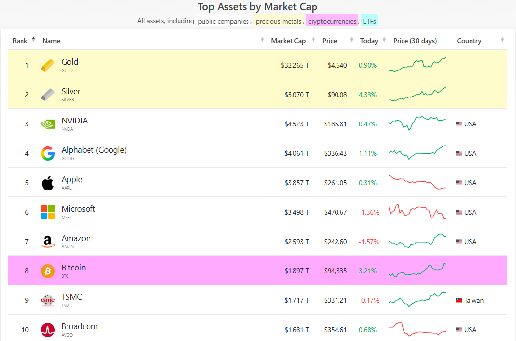 黄金、白银市值超越英伟达,位列全球资产排行榜冠、亚军