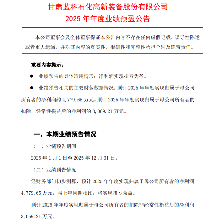 1月14日,蓝科高新(601798.SH)发布了2025年年度业绩预盈公告。