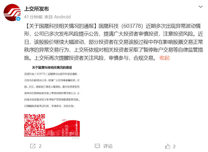 上交所通报,国晟科技相关投资者被暂停账户交易