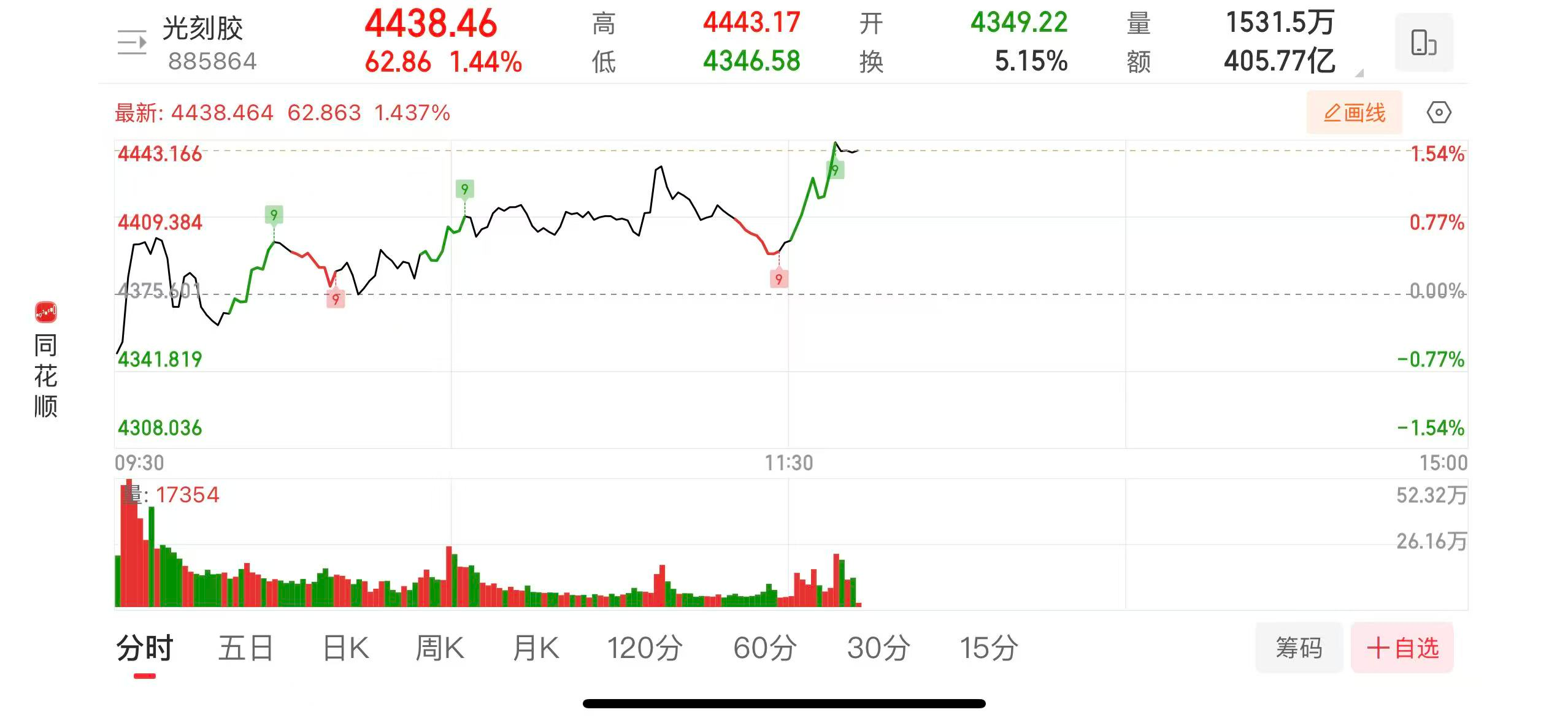 光刻胶概念震荡上行 七彩化学20CM二连板
