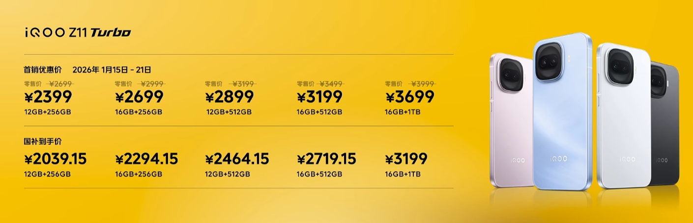 售价方面,iQOO Z11 Turbo首销立减300元,12GB+256GB售价2399元起,国补到手价2039.15元起。