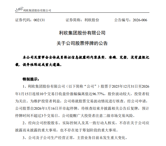 1月18日,利欧股份(002131.SZ)公告称,公司股票于2025年12月31日至2026年1月15日连续10个交易日收盘价涨幅偏离值达96.77%,股价波动较大,投资者较为关注。为维护投资者利益,公司将就股票交易波动情况进行核查。经公司申请,公司股票自2026年1月16日开市起停牌,待核查结束并披露相关公告后复牌,预计停牌时间不超过3个交易日。公司提醒广大投资者注意二级市场交易风险。