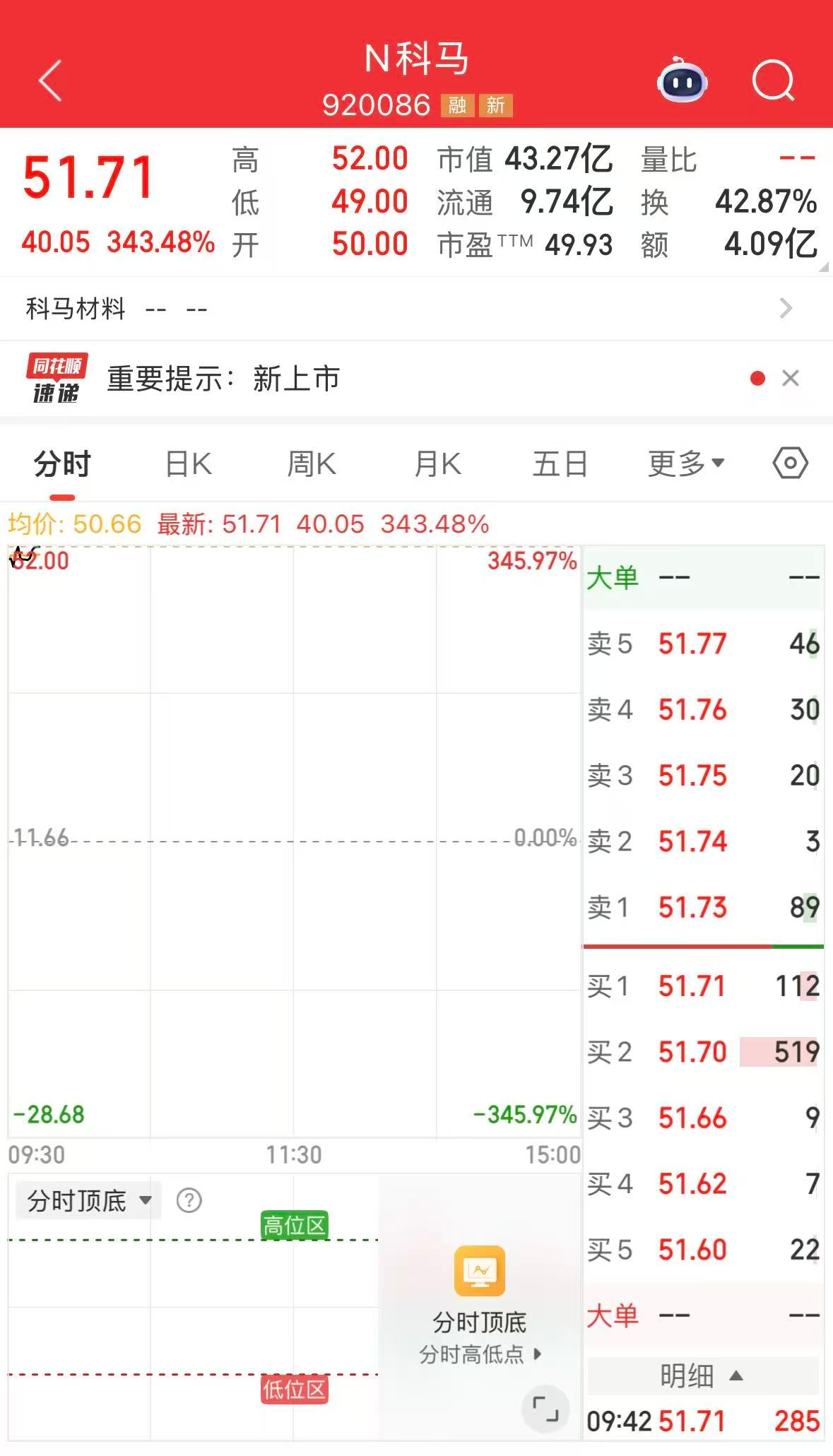 1月16日,N科马(920086.BJ)在北交所上市,发行价为11.66元。上市首日,截止发稿,N科马大涨343.48%,股价报51.71元。