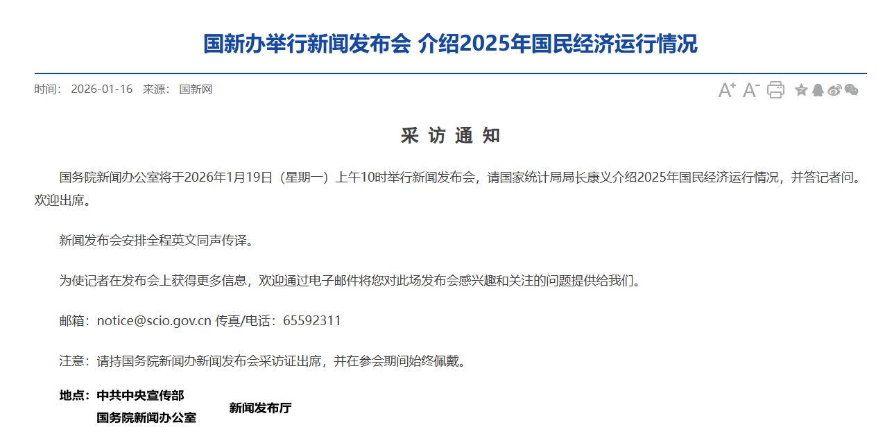 1月16日,据国新办消息,国务院新闻办公室将于2026年1月19日(星期一)上午10时举行新闻发布会,请国家统计局局长康义介绍2025年国民经济运行情况,并答记者问。