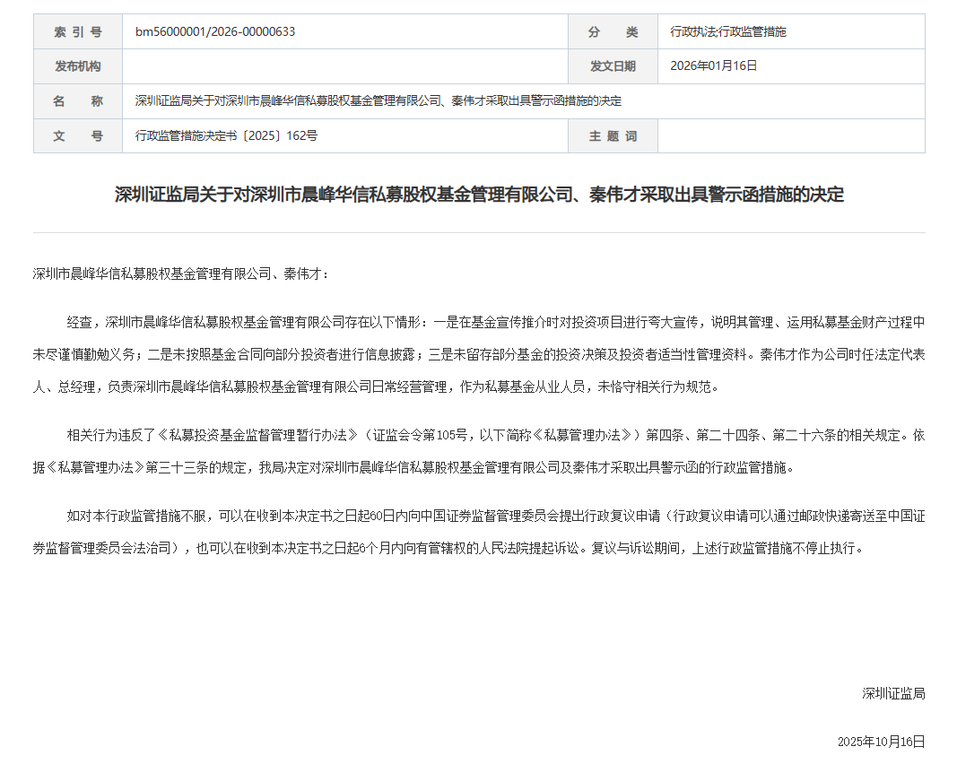 1月16日,深圳证监局发布公告称,经查,深圳市晨峰华信私募股权基金管理有限公司(以下简称“深圳市晨峰华信私募)存在基金宣传推介时对投资项目进行夸大宣传的问题,说明其管理、运用私募基金财产过程中未尽谨慎勤勉义务;未按照基金合同向部分投资者进行信息披露;未留存部分基金的投资决策及投资者适当性管理资料等问题,违反了相关规定。同时,秦伟才作为公司时任法定代表人、总经理,负责深圳市晨峰华信私募日常经营管理,作为私募基金从业人员,未恪守相关行为规范。