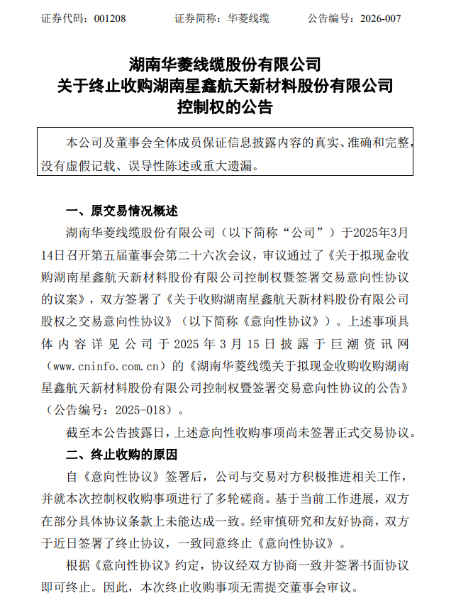 1月19日,华菱线缆(001208.SZ)公告称,公司与交易对方在部分具体协议条款上未能达成一致,经协商一致并签署书面协议,决定终止《关于收购湖南星鑫航天新材料股份有限公司股权之交易意向性协议》。此次终止收购是双方协商一致的结果,无需提交董事会审议。公司表示,该终止事项不会对生产经营和财务状况产生不利影响,亦不存在损害公司和全体股东利益的情形。