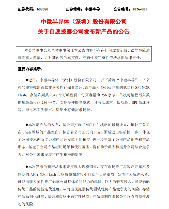 1月19日,中微半导(688380.SH)公告称,公司即将推出首款4M bit容量的低功耗SPI NOR Flash芯片,填补了公司在Flash领域的产品空白。该产品具有低成本、低功耗、高速读写和掉电不丢失等特点,适配小存储需求场景。新产品的发布是公司实施“MCU+”战略的最新成果,丰富了公司产品矩阵和形态,拓宽了应用场景,预计对公司未来发展产生积极影响。