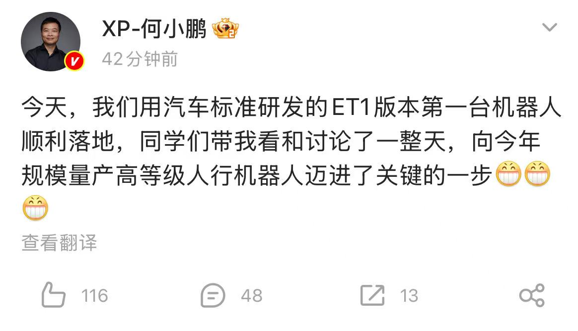 小鹏汽车董事长何小鹏在微博发文称,今天,我们用汽车标准研发的ET1版本第一台机器人顺利落地,向今年规模量产高等级人行机器人迈进了关键的一步。